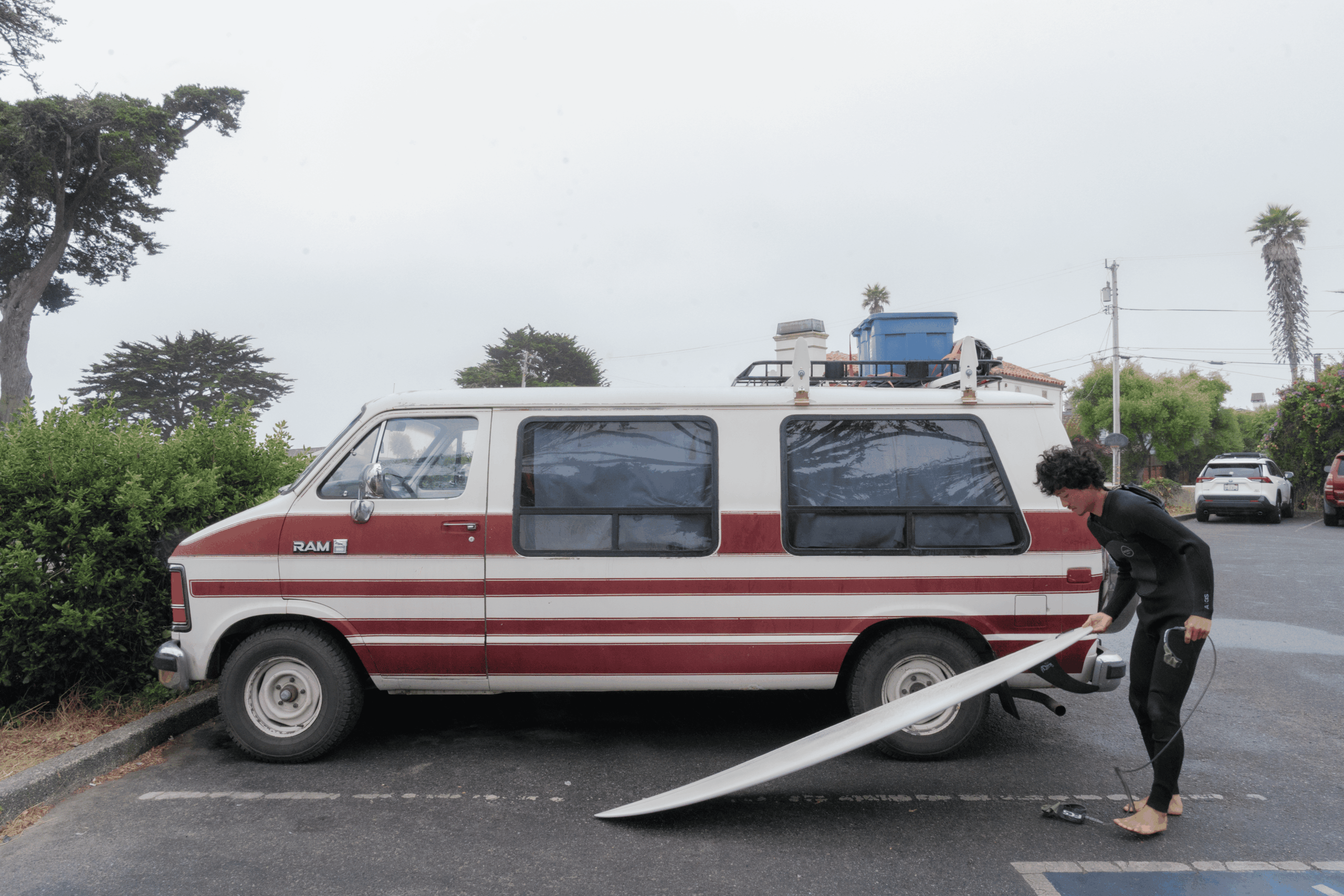 ちょうどその頃、南ウネリが反応し始め、僕らにとって初めてのグランドスウェルがやってきた。ハイウェイ1をサンフランシスコへ向けて走る途中、各地のポイントでは徐々に波が上がり、それとともにサーファーの数も増えていった。どこもコンスタントに胸〜頭サイズのいい波が割れていたが、まだ“これだ!”という波ではなかった。途中妻のロングボードでもできそうな場所で1ラウンド入ったものの、そこでもローカルたちに「もっと南へ行け、サンタクルーズは今いい波だ」と背中を押された。