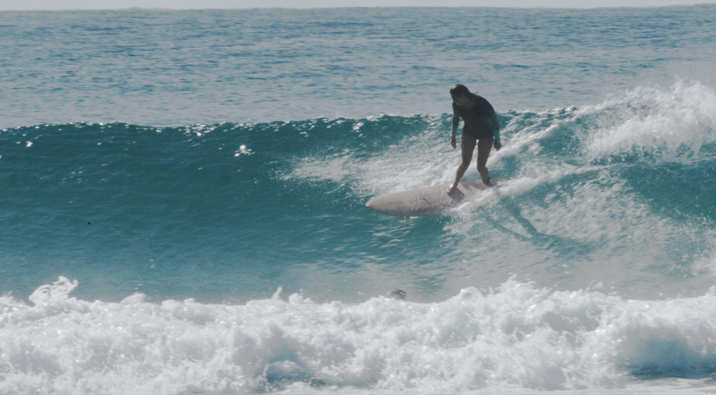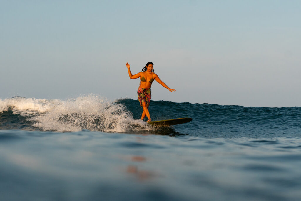 今はロングもショートもどちらも好きで、憧れのサーファーは、ジョージー・プレンダーガスト。滞在していたサーフタウンには女性ロングボーダーがすごく多くて、彼女たちの華麗でスタイリッシュなライディングを見るたびに、もっと上手くなって「クロスステップして、ノーズまで行きたい」って思うようになった。