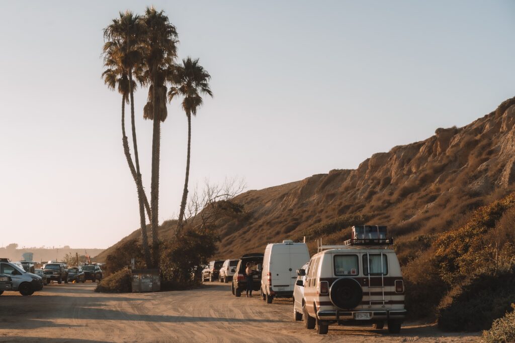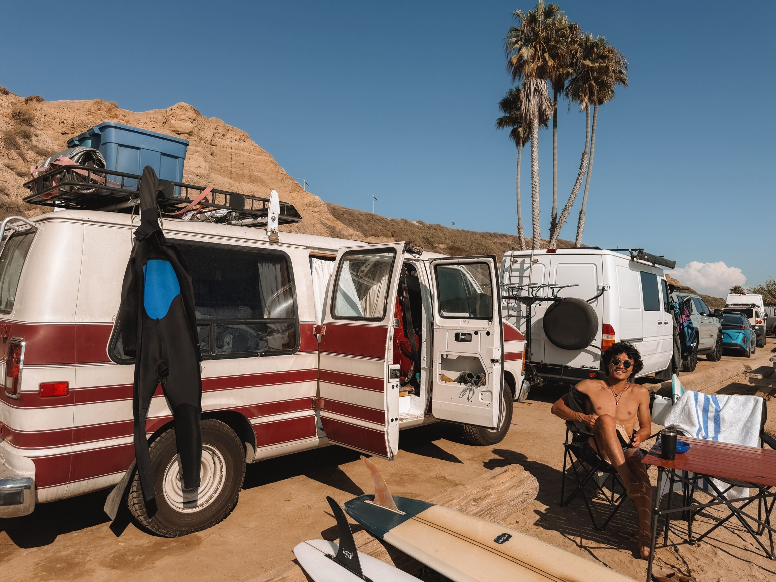 州立公園として管理されているサンオーは、カリフォルニア州内の州立公園の中でも屈指の来場者数を誇る。週末ともなれば、開園1時間前に到着しても、すでにゲート前には長い列ができている。それもそのはず、サンオーの魅力はサーフィンだけに留まらないからだ。ポイントの目の前に駐車できる敷地内には、サーファーが求めるすべてのものが揃っている。良質な波、パームツリーが点在する独特の景観、バレーボールコートやピクニックテーブル。シャワーも景観を損なわぬよう笹で囲われ、どこか素朴な風情がある。バンライフを送る僕らにとって、ここはまさに理想郷だった。サンオーでは、海に入る時間だけでなく、その後に過ごす時間までもが、サーフィンの一部なのだ。