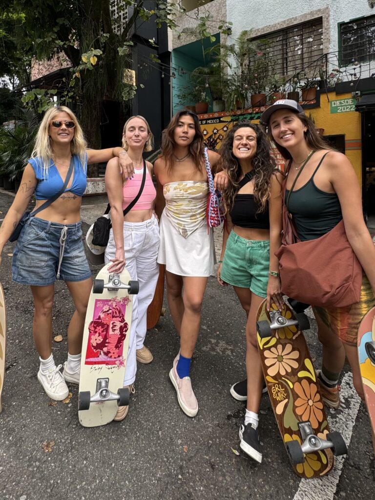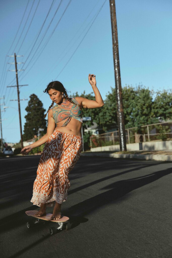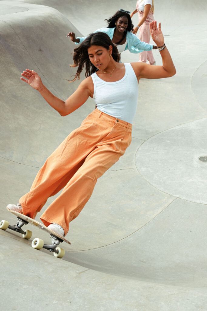 GRLSWIRLのチームライダーとして声をかけてもらったのは、2年近く前。カリフォルニアに引っ越したのが2022年8月で、そのときは仕事もなくて、手元のお金も1,000ドルくらい。叔父さんの家にお世話になっていた。それでも、「サーフィンとスケートを思いきりやって、たくさんの女性たちとスポーツを楽しむ生活がしたい」という気持ちが強かった。GRLSWIRLの本拠地がヴェニスだと知ったとき、「これだ」って思った。初めて参加したスケートのミートアップは、本当に魔法みたいな時間だった。50人以上のガールズたちが集まって、ヴェニスのスケートパークから桟橋まで、みんなでスケートしていく。その光景は、まさに思い描いていたカリフォルニアのシーンだった。周りは素敵な女性ばかりで、スケートして、サンセットを見て、笑って。ただ一緒に滑っているだけなのに、心の底から満たされる時間だった。その瞬間から、「この感覚をずっと感じていたい」「この人たちと一緒にいたい」と思って、すべてのイベントに参加して、ボランティアも続けた。そうして活動しているうちに、いつも積極的に参加してスケートしている姿を見てくれていたメンバーから、チームに入らないかと声をかけてもらったの。今はチームの一員として、同じような境遇のガールズたちを支えながら、コミュニティを広げている。