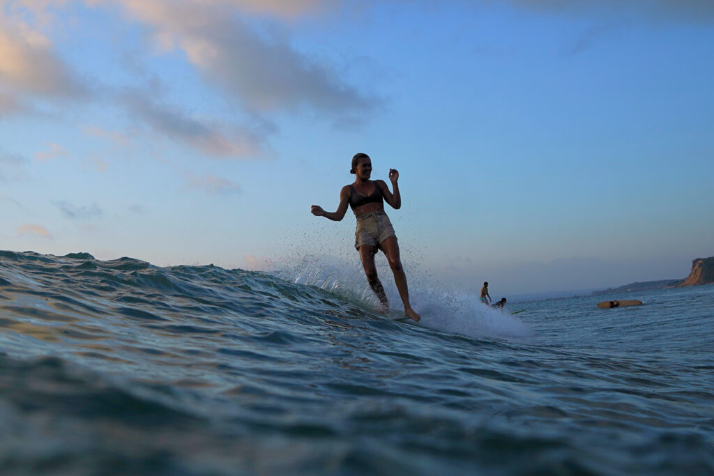 今はロングもショートもどちらも好きで、憧れのサーファーは、ジョージー・プレンダーガスト。滞在していたサーフタウンには女性ロングボーダーがすごく多くて、彼女たちの華麗でスタイリッシュなライディングを見るたびに、もっと上手くなって「クロスステップして、ノーズまで行きたい」って思うようになった。